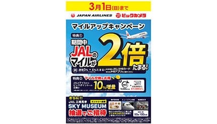 JALの格納庫見学や機内食体験が当たる!ビックカメラの「JALマイルアップキャンペーン」開催中![]()
